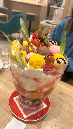 おはよ🦋 きいです👶🏻 昨日はご来店ありがとうございました😿➰💧 しゅっきん前に大学の友達5人で めちゃおっきいパフェ食べた🍨🍓 生クリームいっぱい食べるの苦手だから アイス担当してたらめっちゃ寒くて 限界だったあ 一生分のアイス食べたから当分いらないぐらい😹🩵 今日は友達とご飯行くのでお休みもらってます😿➰💧